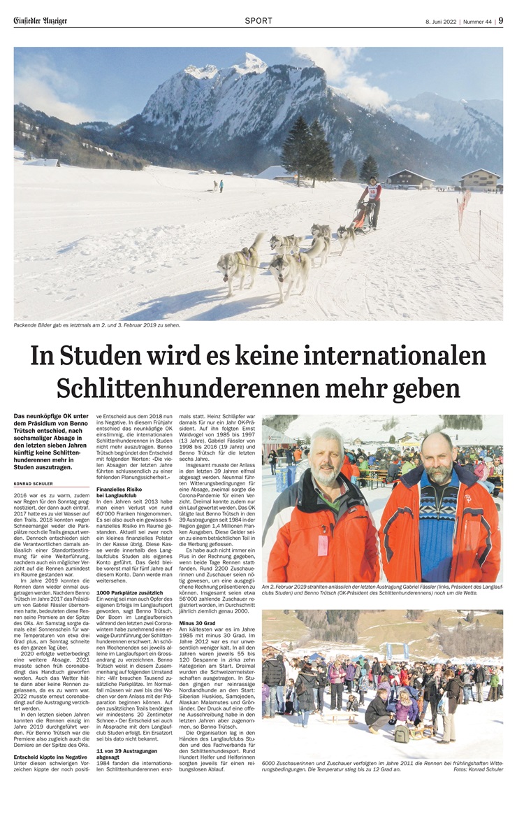 Das neunköpfige OK unter dem Präsidium von Benno Trütsch entschied, nach sechsmaliger Absage in den letzten sieben Jahren künftig keine Schlittenhunderennen mehr in Studen SZ auszutragen.